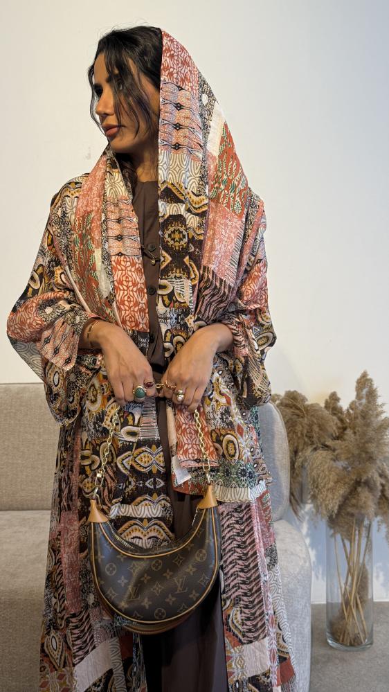 عبايه قماش شيفون خفيف حدا مزخرف مع طرحة من نفس القماش مزخرفه قصه كلوش مع اكمام وسيعه
